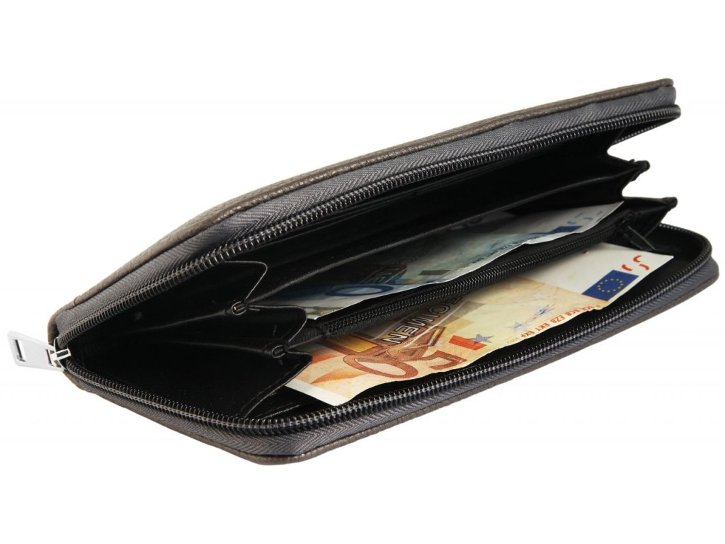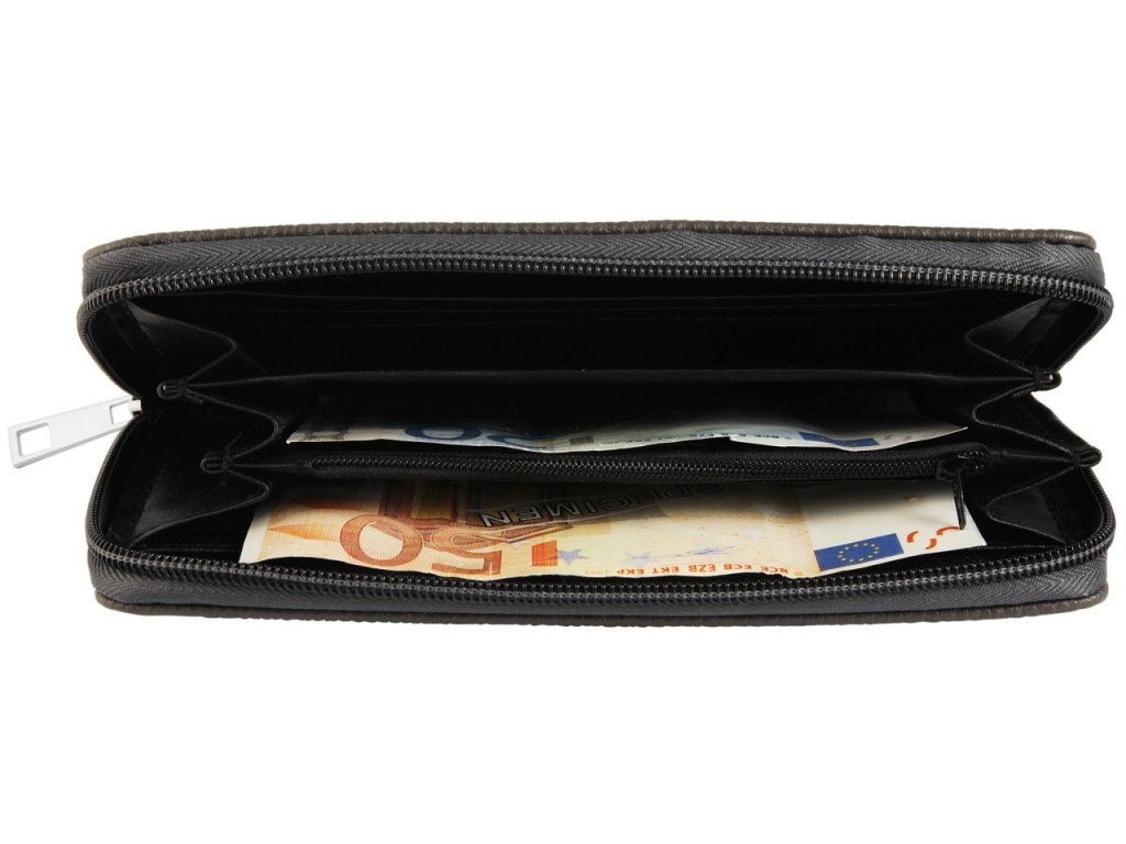 Dámska peňaženka vyrobená z imitácie kože. Peňaženka na šírku široká 19 cm a vysoká 10 cm. Uzatvára sa na zips. Má 5 priehradok na bankovky, priehradku na drobné a 8 priehradok na platobné karty. Je priestranná a praktická.
