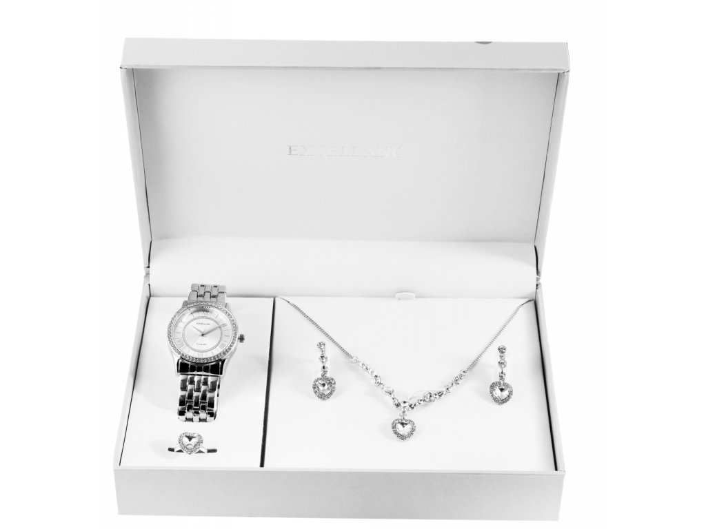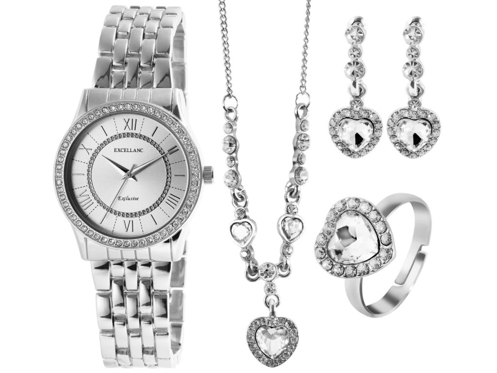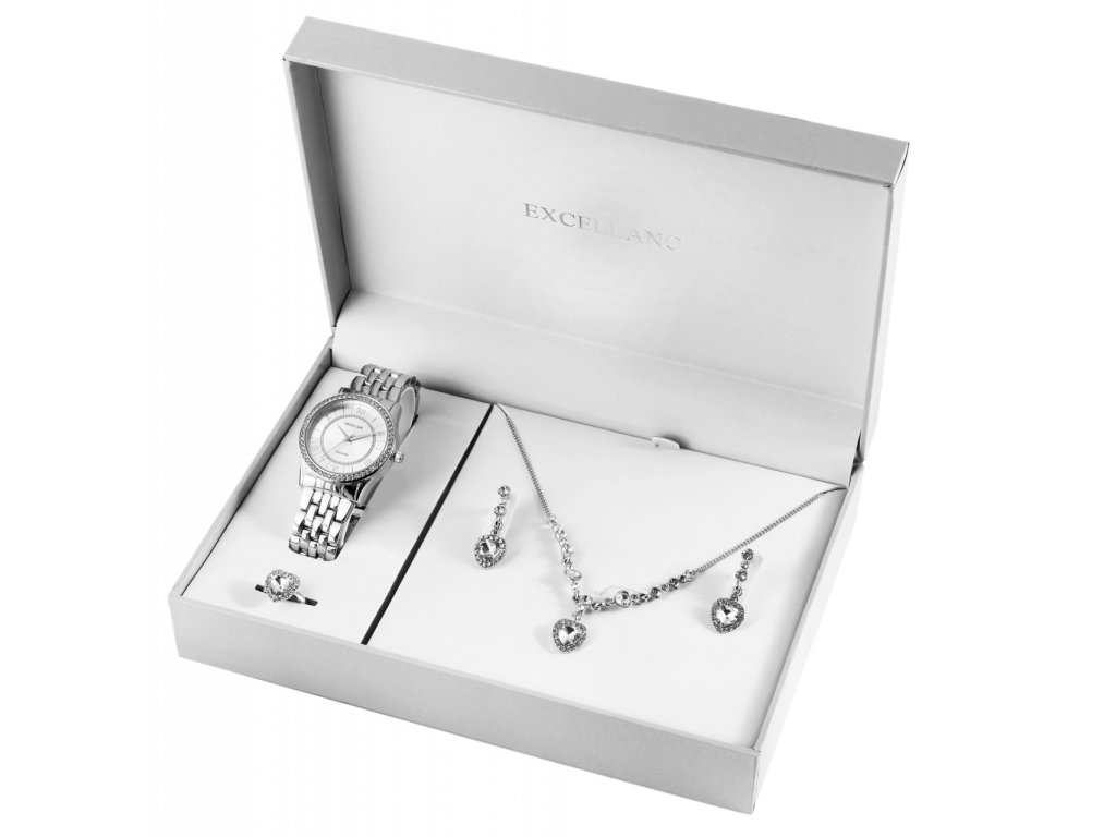 Excellanc predstavuje luxusnú darčekovú sadu pre dámy, ktorá obsahuje náramkové hodinky, náhrdelník, náušnice a prsteň. Všetky šperky sú prepojené harmonickým vzorom srdca, ktorý je doplnený veľkým simili kameňom a obklopený 16 drobnými drahokamami. Prsteň je navyše vybavený otvoreným krúžkom pre možnosť úpravy veľkosti. Náhrdelník má dĺžku 58 cm a je doplnený o 6 cm predlžovacia retiazka, čo umožňuje jej prispôsobenie každému outfitu. Hodinky sú klasické, trojručičkové, s quartzovým strojčekom, zdobené 56 simili kameňmi dĺžka 22 cm. Celá sada je dodávaná v darčekovej krabičke s rozmermi 14,8 x 21,5 x 5,8 cm. Zadná časť strojčeka hodiniek je vyrobená z nerezovej ocele.