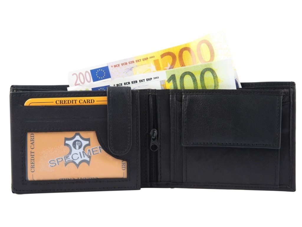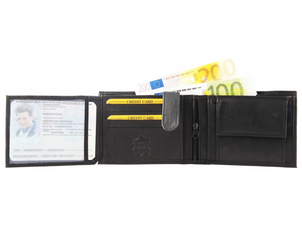 Praktická pánska peňaženka SteinMeister z pravej kože, čierna vo formáte na dĺžku. Má 6 priehradok na karty, dve na bankovky a vrecko na mince na patentku. Na bezpečné uloženie dôležitých drobností môže slúžiť aj vnútorná priehradka na zips. Peňaženka má praktickú priehľadnú priehradku na dokumenty. Vyrobená je z pravej prírodnej ovčej kože, ktorá je príjemná na dotyk a pri správnej údržbe Vám vydrží veľmi dlho. Rozmery peňaženky sú v zaklapnutom stave 12 cm na dĺžku a 9 cm na výšku.